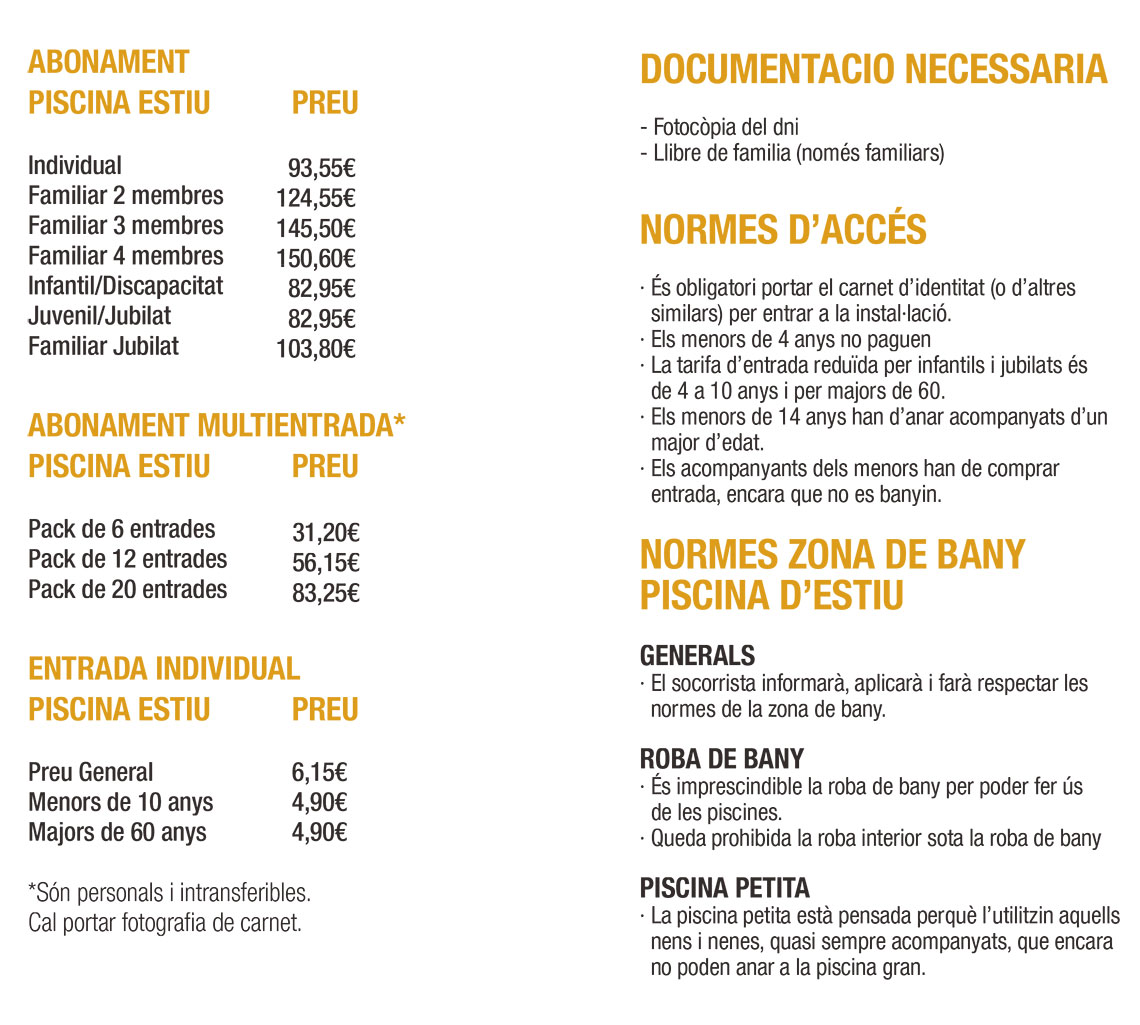 Els usuaris poden gaudir de la piscina de diverses maneres: amb una entrada individual, un pack d’entrades o abonaments en diversos formats (individual, familiar, jubilat, infantil, discapacitat…). La compra d’abonaments ja es pot fer des del 21 de maig.