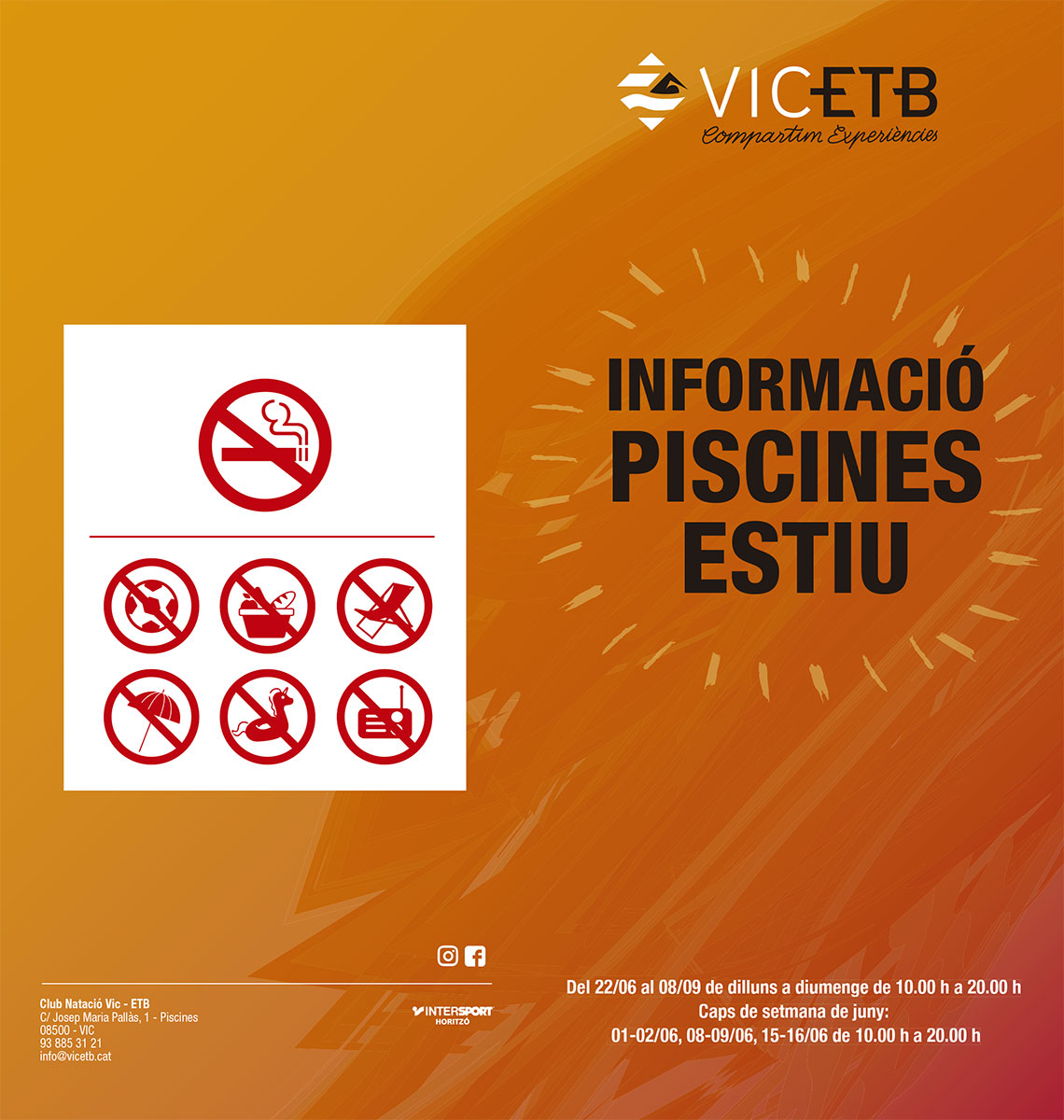 Des de l'1 de juny hem obert la piscina els caps de setmana i ara, a partir del 22 de juny, de dilluns a diumenge i fins al 8 de setembre. Viu l’estiu amb el Vic ETB!